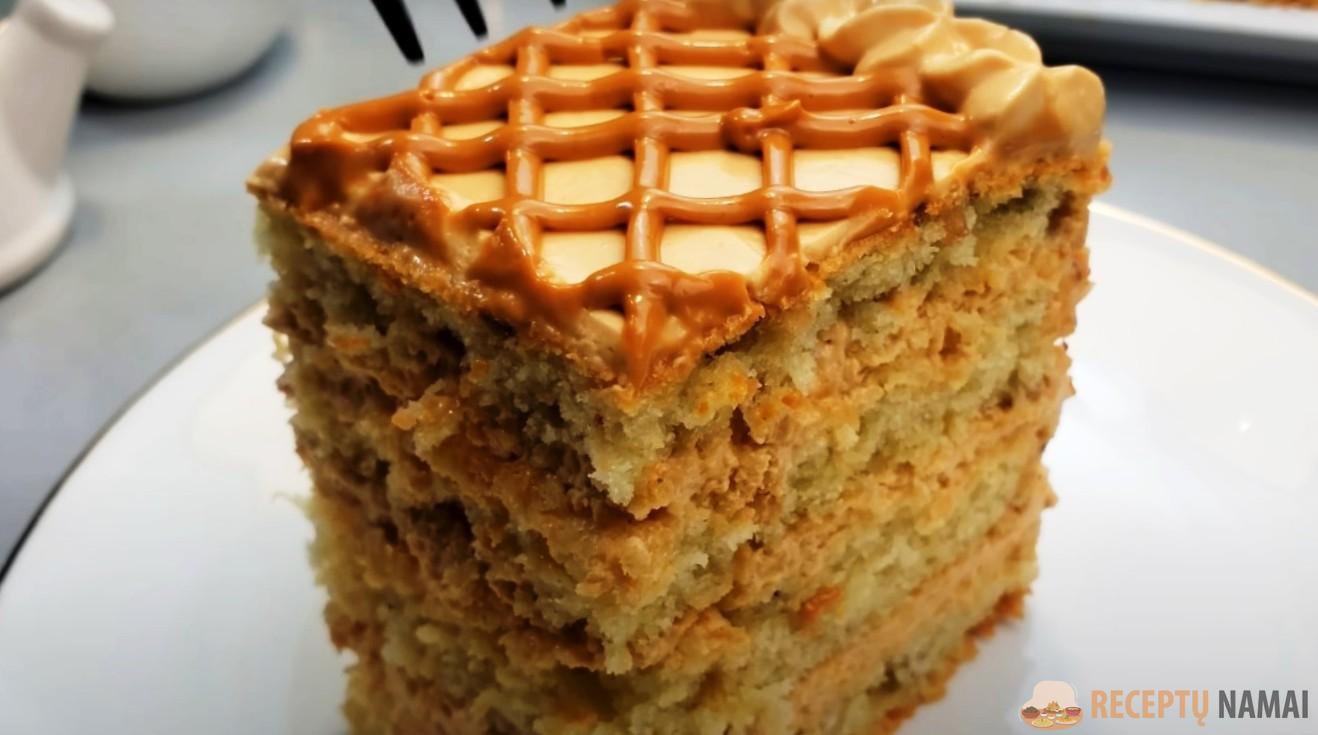Kremu sutepkite torto šonus ir viršų. Tortą galite papuošti smulkintais riešutais, likusiu kremu arba biskvito atraižomis.