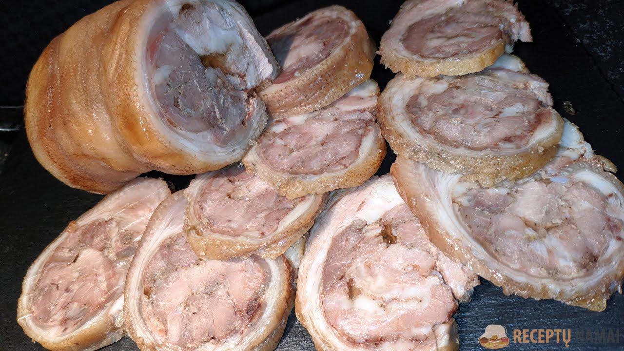 4. Leidžiu jai visiškai atvėsti, uždengiu lenta ir ant viršaus uždedu 2 kilogramų svorį, tada vyniotinis bus plokščias. Visą naktį vyniotinis gulėjo šaldytuve, nuimu plėvelę ir virves, plonai supjaustau. Šaldytuve ritinys buvo be svorio, tik uždengtas lenta, gerai išlaiko formą, nesubyra. Gaunasi sveikas, sotus, skanus vyniotinis. Kiaulienos odoje yra kolageno, naudingo plaukams, nagams, odai. Labai skanus vyniotinis gavosi.