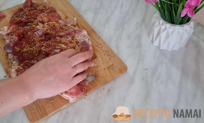 1. 1 kiaulienos sprandinę 4 valandoms pamerkite į šaltą vandenį, labai gerai nukoškite visą odos perteklių. Aš išpjoviau kaulą. Išsaugokite sau receptą, nuoroda į vaizdo įrašą pasidalykite su draugais bet kuriame socialiniame tinkle, ačiū. Supjaustau didelius mėsos gabalus. Uždengiu maišeliu ir pamušu mėsą, kad ji būtų minkštesnė. Prancūziškas garstyčias. Jos saldžios – 1 valgomasis šaukštas. Druskos pagal skonį. Maltų juodųjų pipirų – 1/4 arbatinio šaukštelio.