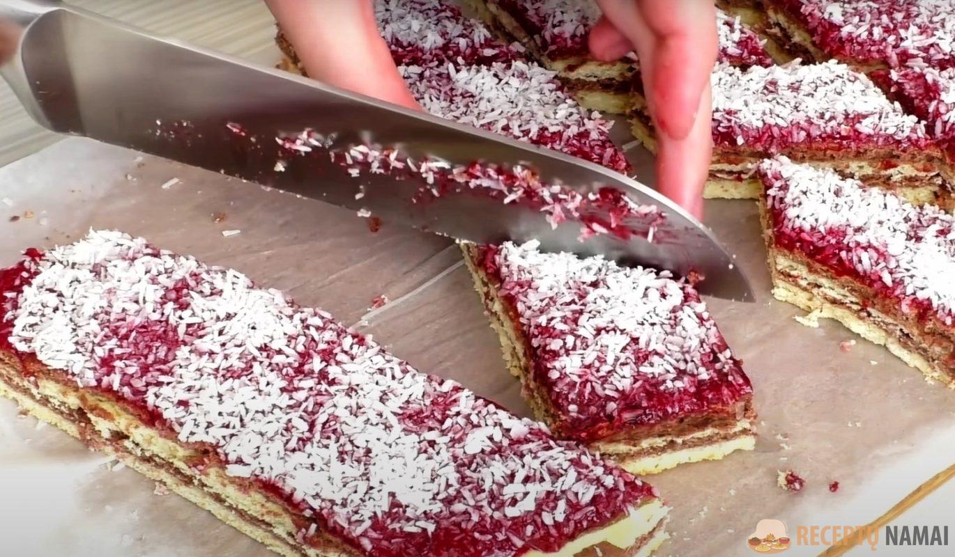 Iškepusį didelį sluoksnį taip pat reikia padalyti į mažus sausainių gabalėlius. Tai gardus desertas prie arbatos.