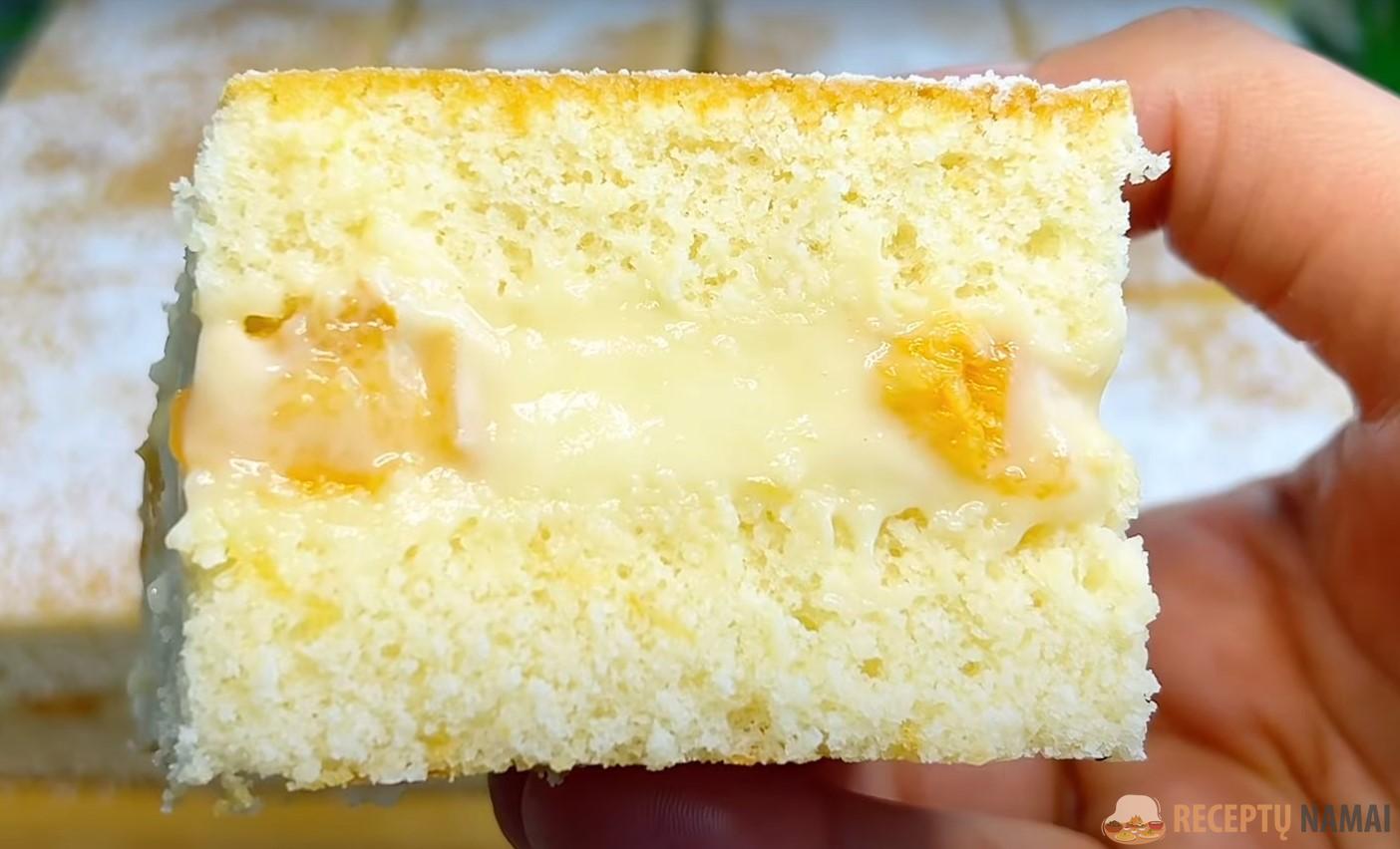 Svarbu kepimo metu neatidaryti orkaitės. Iškepusį pyragą rekomenduojama porai valandų įdėti į šaldytuvą.