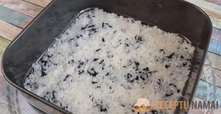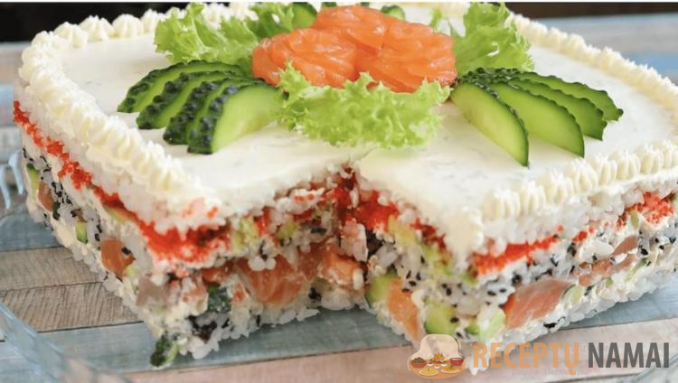 Į pirmąją ryžių porciją suberiu susmulkintą nori lakštą ir išmaišau. Paimu 20×20 cm kvadratinę nuimamą formą, patepu kraštus aliejumi ir aptepu ryžius nori, sutankindama šlapiomis rankomis. Toliau dedama pusė kreminio sūrio su sojų padažu, agurkas, raudona žuvis. Ant viršaus užtepu antrąją ryžių porciją, prieš tai sumaišiusi ją su dviem šaukštais skrudintų sezamo sėklų.