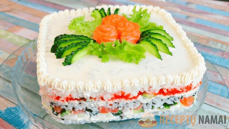 Tada atsargiai išimu formą. Ant torto viršaus užtepu 50–80 g kreminio sūrio, o iš likusio sūrio aplink kraštus padarau mažas „gėlytes“. Papuošiu raudonos žuvies gabalėliais, agurku ir salotų lapais. Atrodo labai šventiškai, o perpjovus – lyg pasakoje. Skonis kaip dideli, minkšti sušiai, tik dar geresnis.