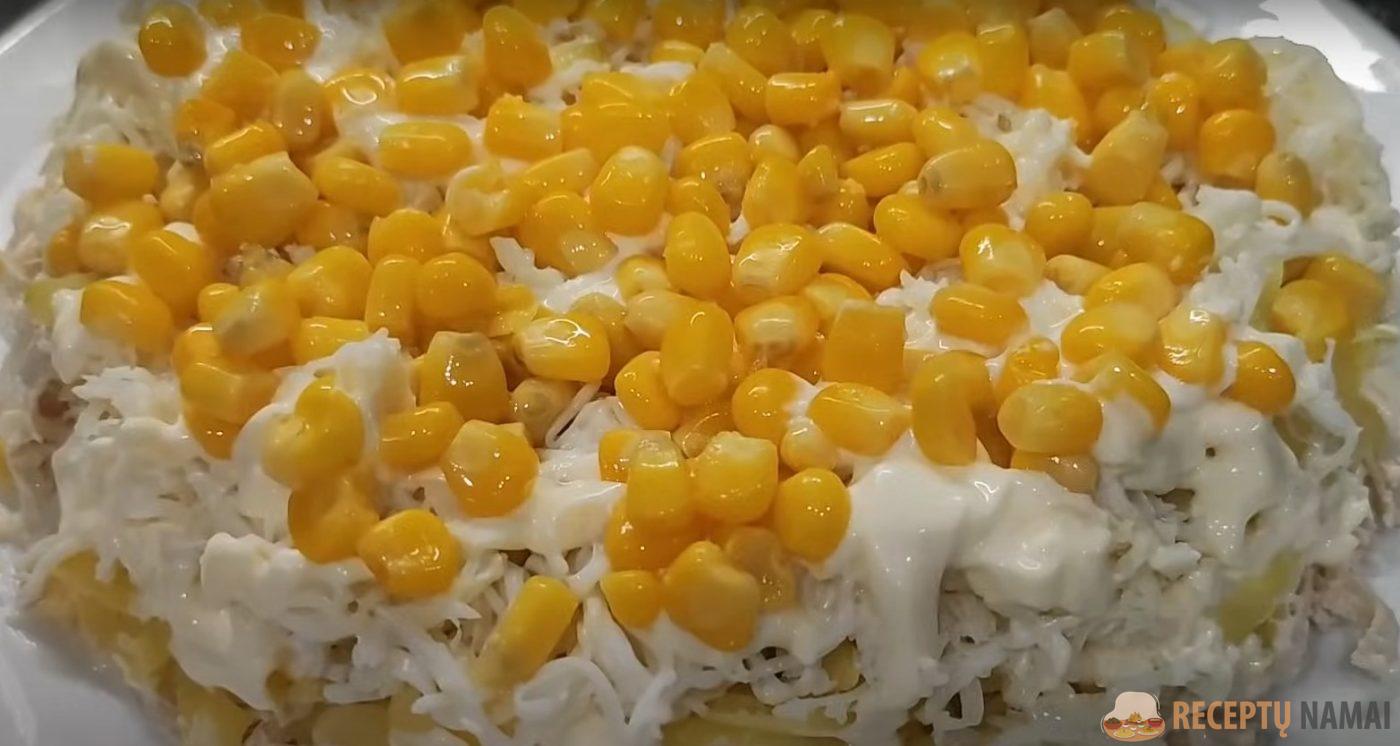 . Baltymų sluoksnį patepame majonezu ir ant jo dedame kukurūzų.
