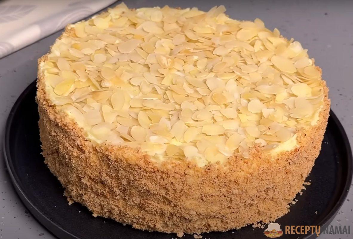 Papuoškite tortą migdolų žiedlapiais ir sausainių trupiniais.
