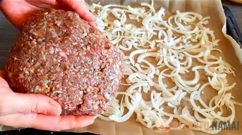 Iš maltos mėsos suformuokite didelius ir plokščius kotletus, išdėliokite juos ant svogūnų.