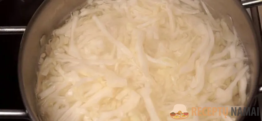 Smulkiai supjaustykite kopūstą, sudėkite į verdantį vandenį ir virkite, kol pusiau išvirs, 5–7 minutes nuo užvirimo.