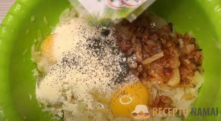Paruoškite maltas daržoves, į kopūstus sudėkite pakepintus svogūnus, įmuškite kiaušinius, pagal skonį įberkite manų kruopų, druskos, žolelių ir prieskonių.
