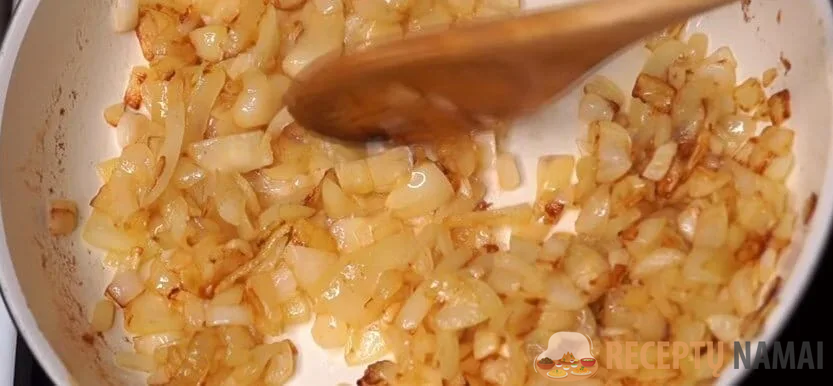 Tuo tarpu smulkiai supjaustykite svogūną ir kepkite keptuvėje su sviestu iki auksinės rudos spalvos.