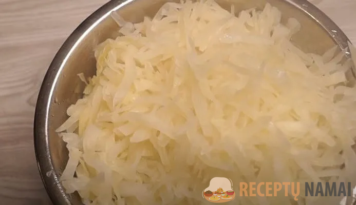 Kopūstus sudėkite į kiaurasamtį ir leiskite šiek tiek atvėsti, tada nuspauskite drėgmės perteklių.