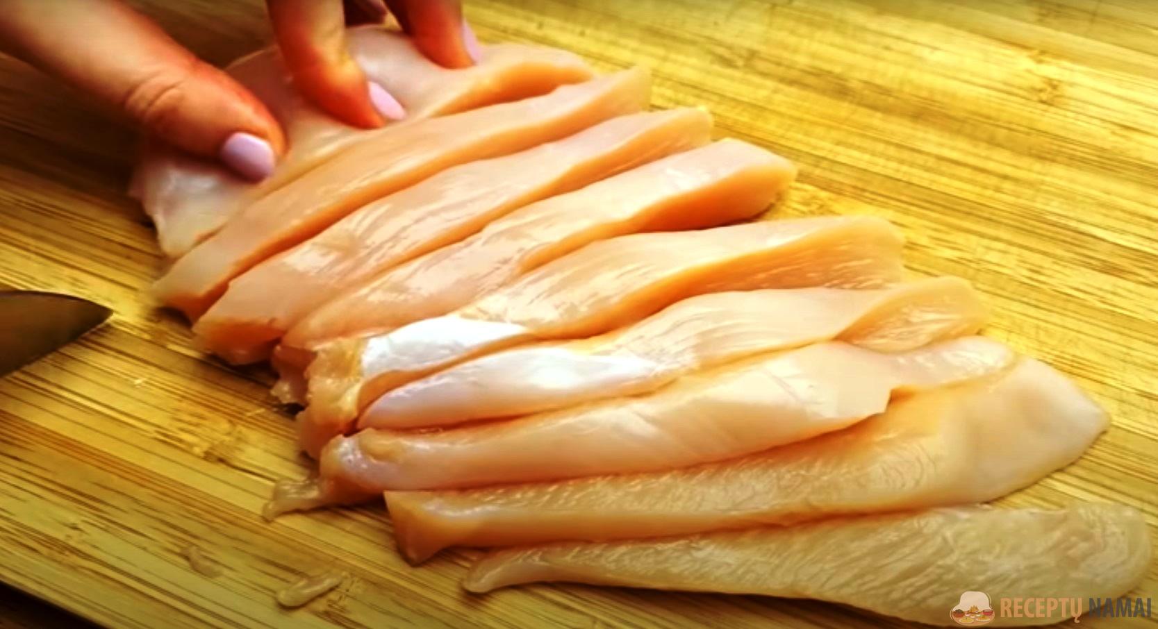 Kepenėles nuplaukite, leiskite joms nusausėti, pašalinkite visas venas ir supjaustykite gabalėliais