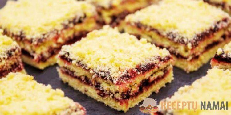 - Druska – žiupsnelis; cukrus – 130 g; vanilinas – pagal skonį; kiaušinis – 1 vnt.; uogienė – pagal jūsų skonį