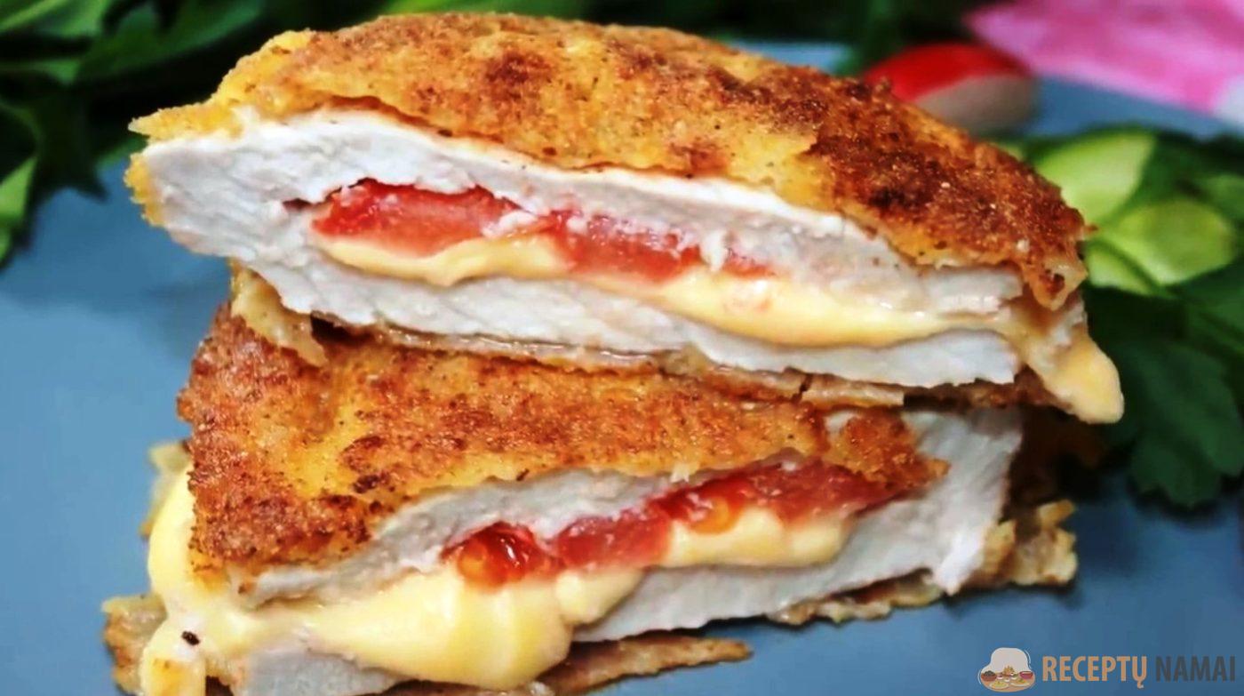 Į kiekvienos kišenės vidų – kotletus – įdėkite po porą sūrio juostelių ir porą paprikų apskritimų
