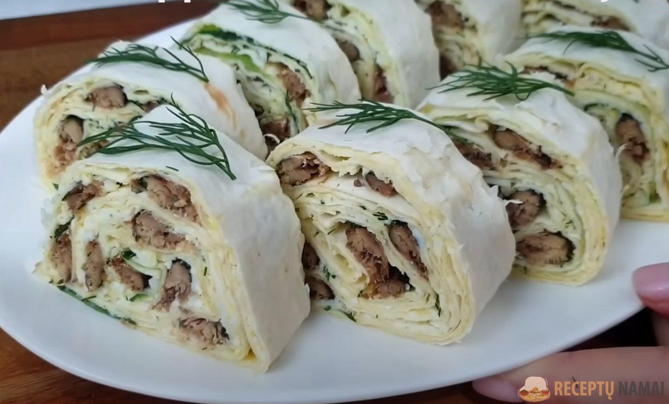 Belieka tik supjaustyti vyniotinį porcijomis ir patiekti į stalą. Gaunasi originalus ir skanus užkandžio patiekalas.