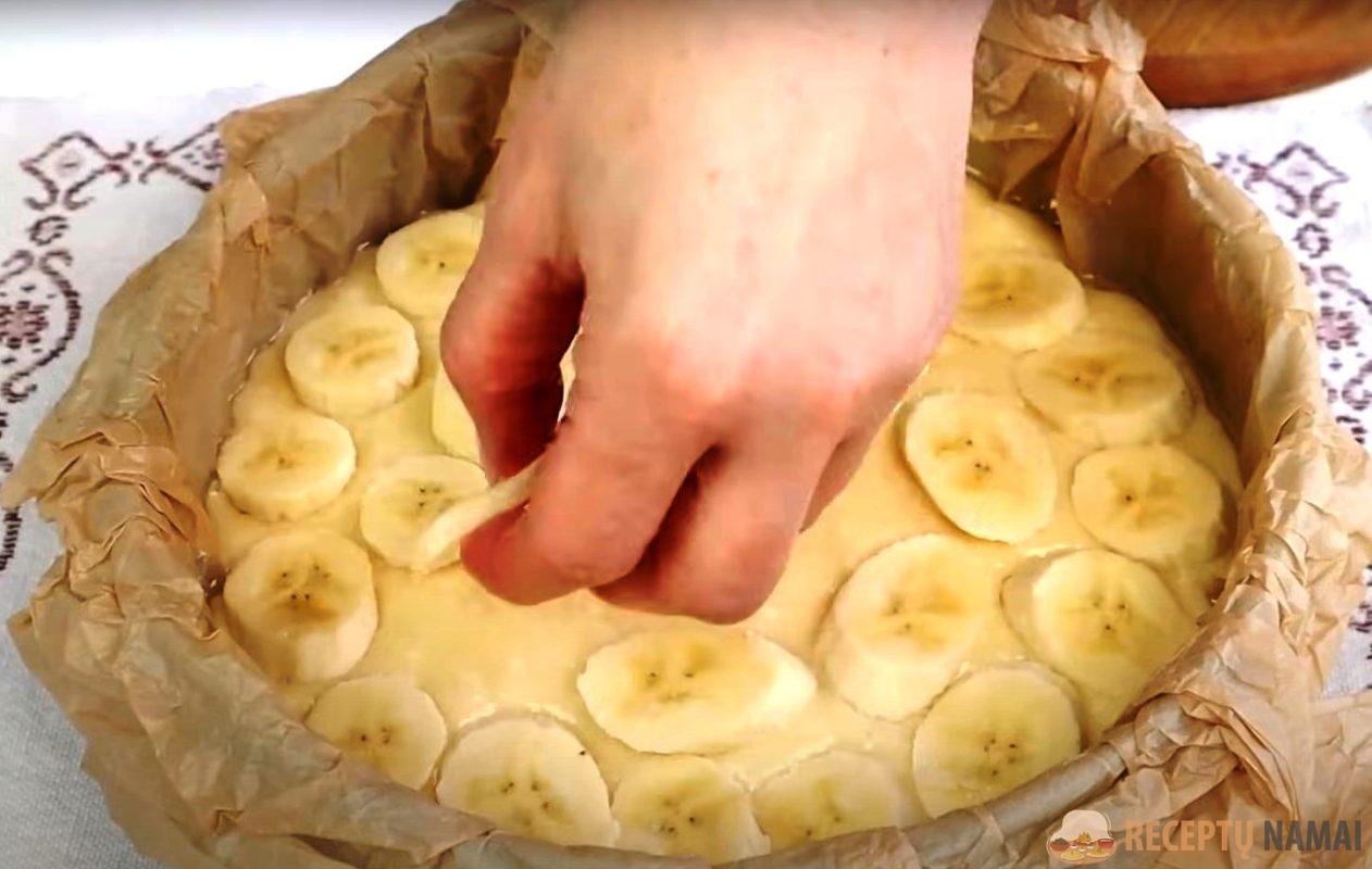 tešlą į kepimo formą, ant viršaus sudėkite griežinėliais supjaustytus bananus. Trupiniams sviestą sumaišykite su cukrumi ir miltais,