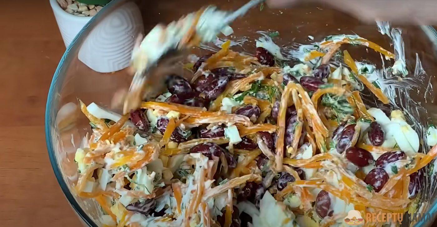 Virtos morkos susmulkinamos ant vidutinio dydžio tarkavimo žiedelių, kiaušiniai supjaustomi mažais kubeliais. Morkos ir kiaušiniai siunčiami į lėkštę su pupelėmis. Česnako skilteles išspauskite per presą ir įmaišykite į salotas