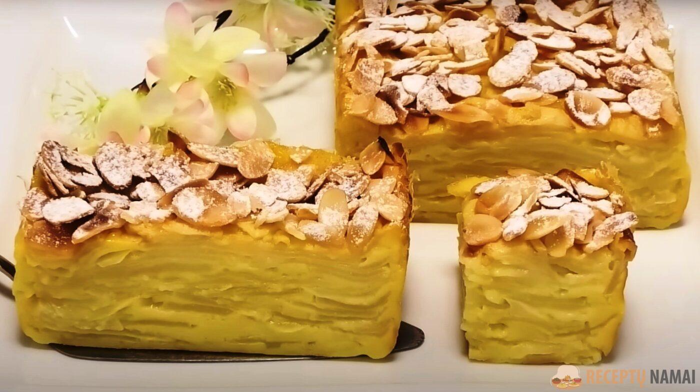 Prieš kepimą patariame pyragą papuošti migdolų žiedlapiais. Iškepusį pyragą palikite atvėsti, tada apibarstykite cukraus pudra.