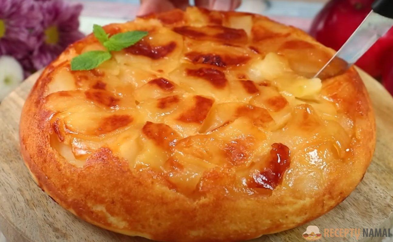 Rezultatas – minkštas saldus obuolių pyragas be orkaitės.