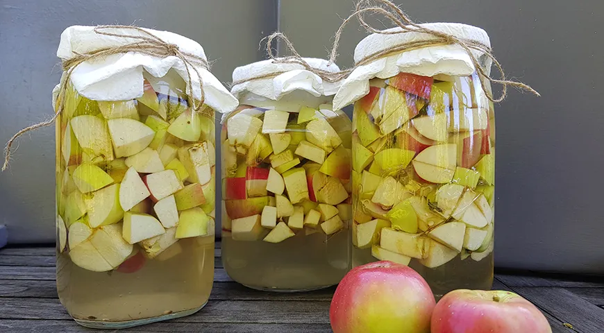 2. Ištirpinkite 3 šaukštus medaus iš anksto užvirintame šiltame vandenyje ir užpilkite juo obuolius: vanduo turėtų apsemti obuolių masę 2–3 cm. Naudokite nepažeistus stiklinius arba emaliuotus indus.