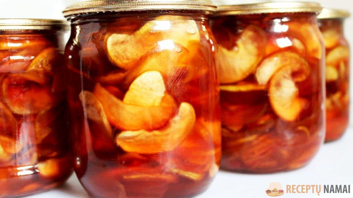 Kartais į tokias obuolių skilteles įdedu graikinių riešutų, išdžiovinu, pašalinu jų odelę ir supilu į paskutinę virimo vietą, užvirinu, pavirinu 5 minutes ir supilu į stiklainius