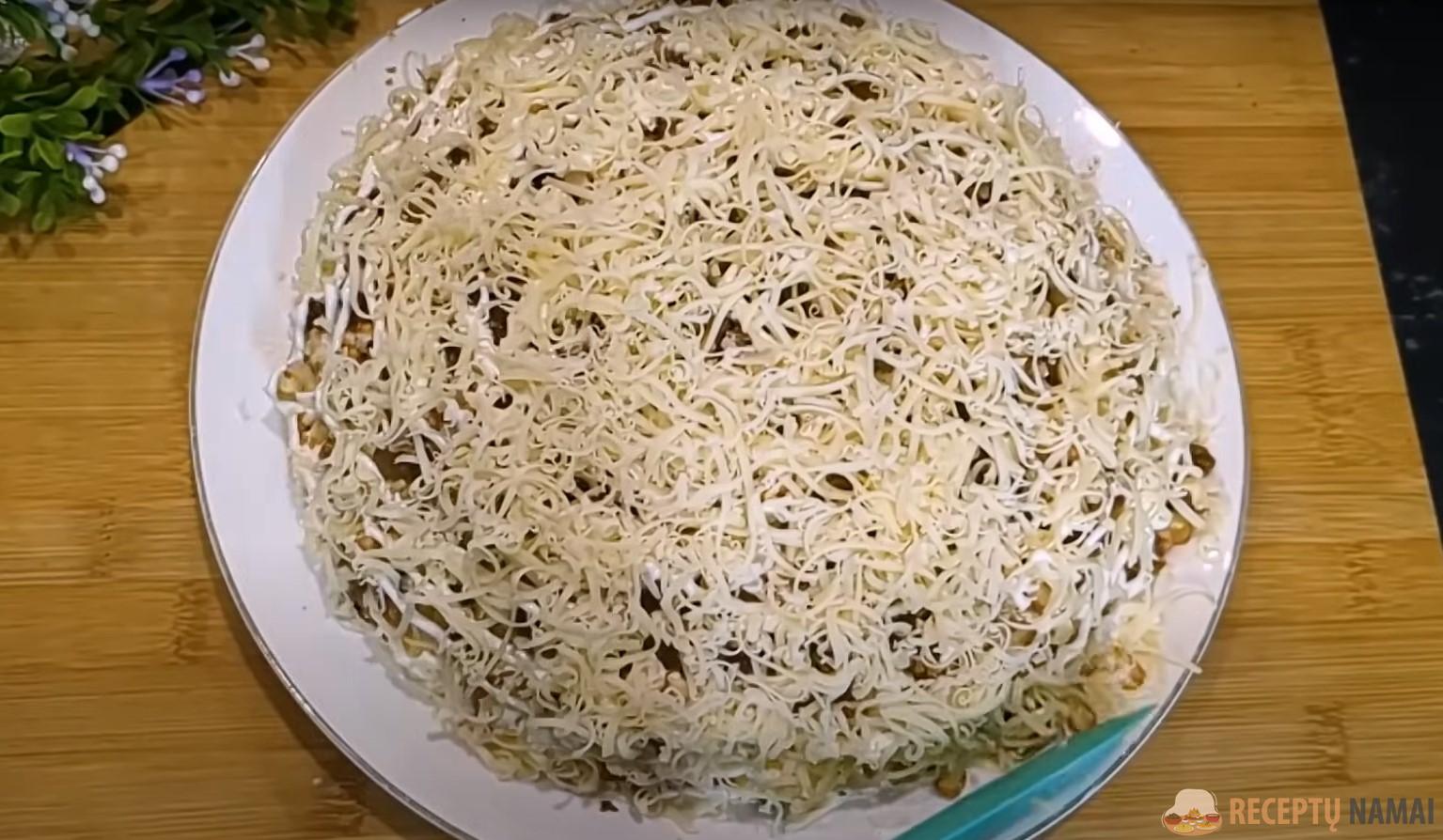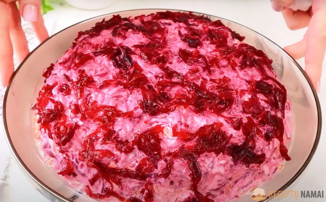 smulkia tarka ir ½ jų sumaišykite su šaukštu majonezo. Paskutiniu salotų sluoksniu dėkite burokėlius į majonezą