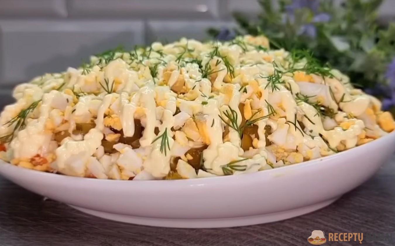 Žuvies filė supjaustykite nedideliais kubeliais, panašiai supjaustykite virtus kiaušinius. Dubenyje sumaišykite žalią kiaušinį su druska ir majonezu