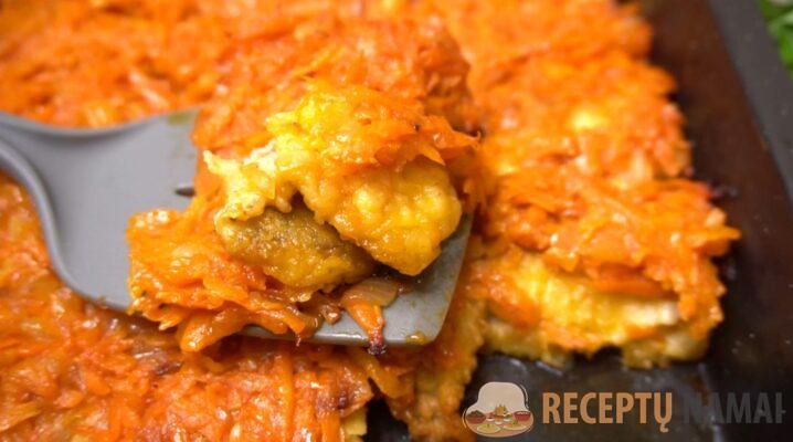 Svogūnus supjaustykite ketvirčiais žiedų, žuvį sudėkite į atskirą dubenį. Keptuvėje apkepkite svogūnus. Morkas sutarkuokite stambia tarka, sudėkite prie svogūnų