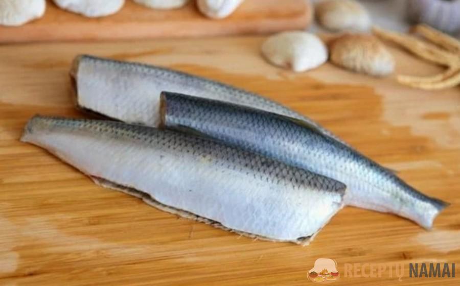 Tada supjaustykite silkę. Žuvį galite sūdyti patys arba nusipirkti jau paruoštą.