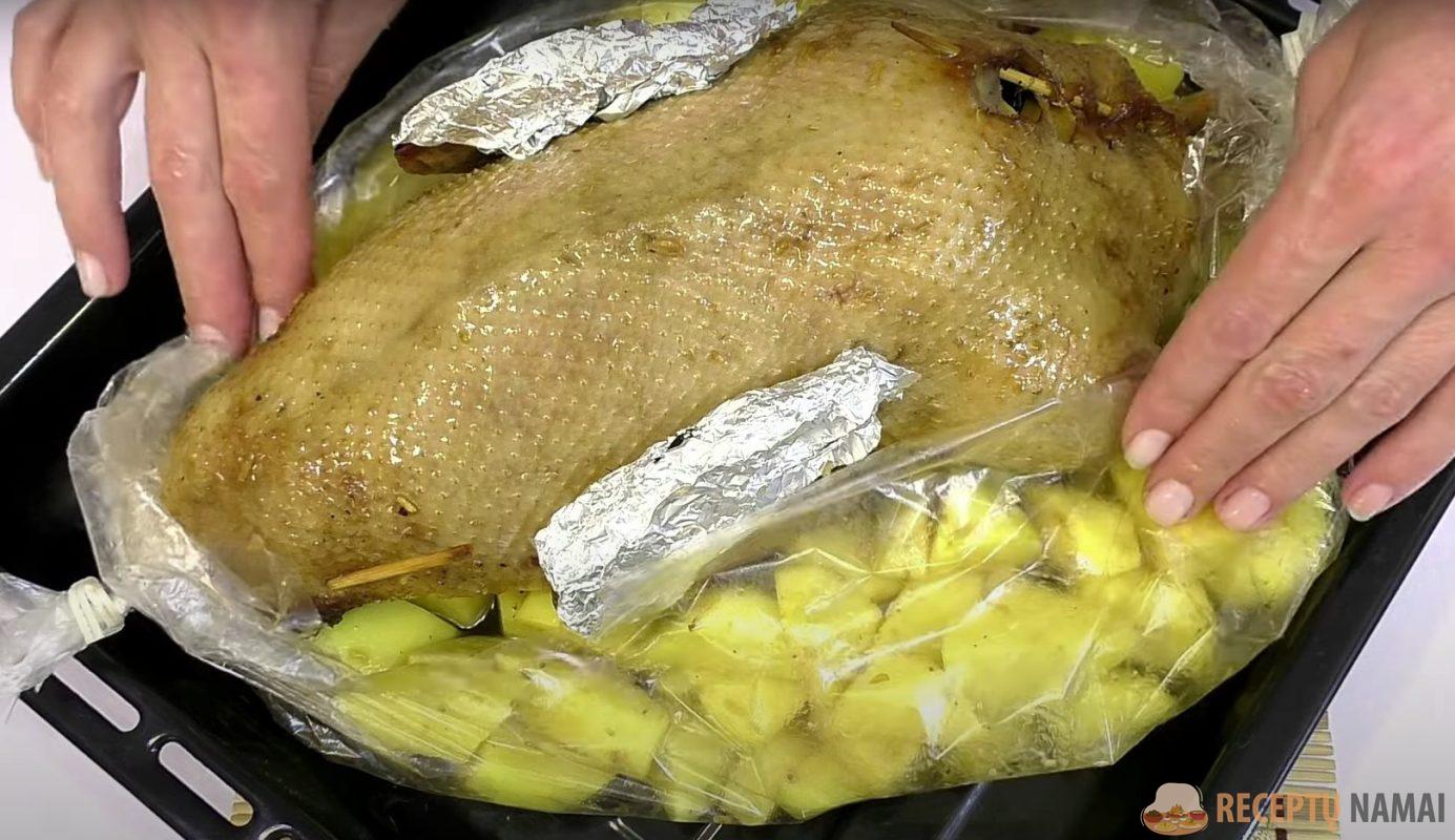 . Bulves uždenkite maišu ir antį kepkite dar 30-40 min.