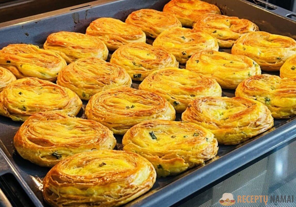 Sudėkite paplotėlius siūle žemyn ir palikite pailsėti. Kiekvieną pyragą iškočiojame į plokštesnius ovalius pyragėlius, kuriuos susukame į ritinėlius