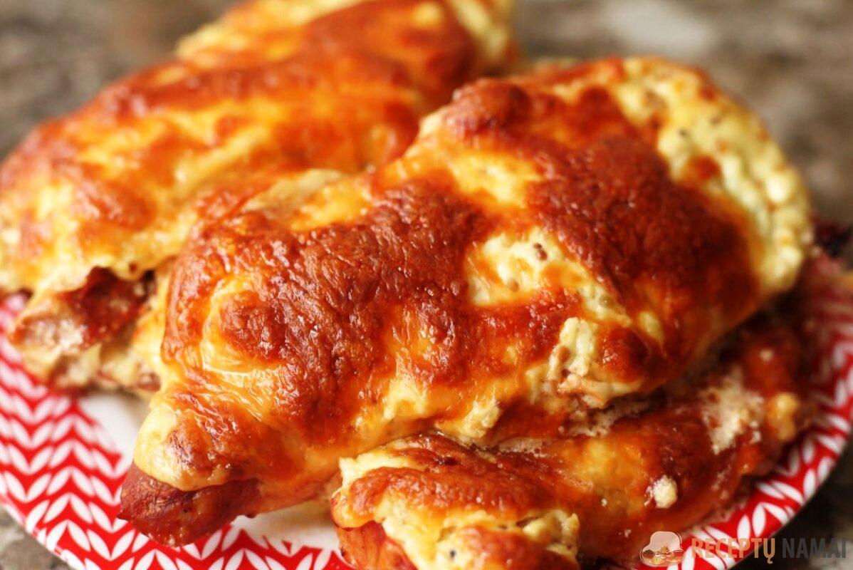 . Gabalėlius sudėkite į kepimo formą, užpilkite padažu ir apibarstykite tarkuotu sūriu.