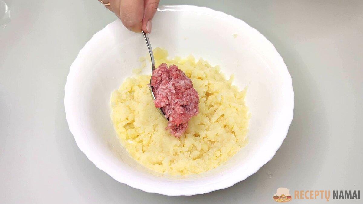 . 3. Į bulves įdedu bet kokią maltą mėsą. Šiuo atveju naudoju maltą kiaulieną (galite naudoti maltą jautieną arba paukštieną).