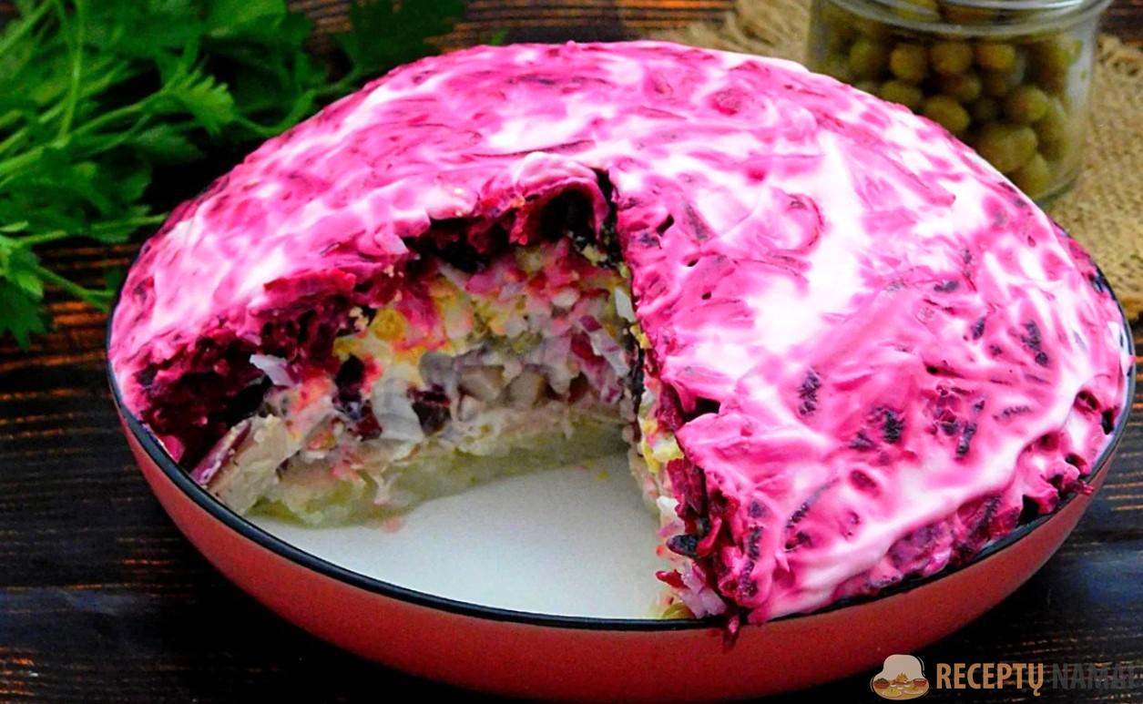 . Gaminimo procesą užbaigkite majonezo sluoksniu, 2 valandas palaikykite šaldytuve, kad įsigertų.