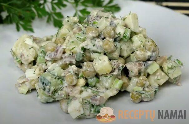 . Kitas sluoksnis gaminamas iš žaliųjų žirnelių. Tada nulupami kiaušiniai ir sutarkuojami ant vidutinio dydžio tarkavimo dantų. Kiaušinių drožlėmis apibarstykite žirnių sluoksnį