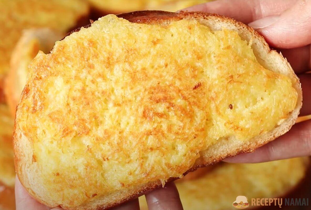 Batoną supjaustome nedidelėmis riekelėmis, į kurias sudedame bulvių