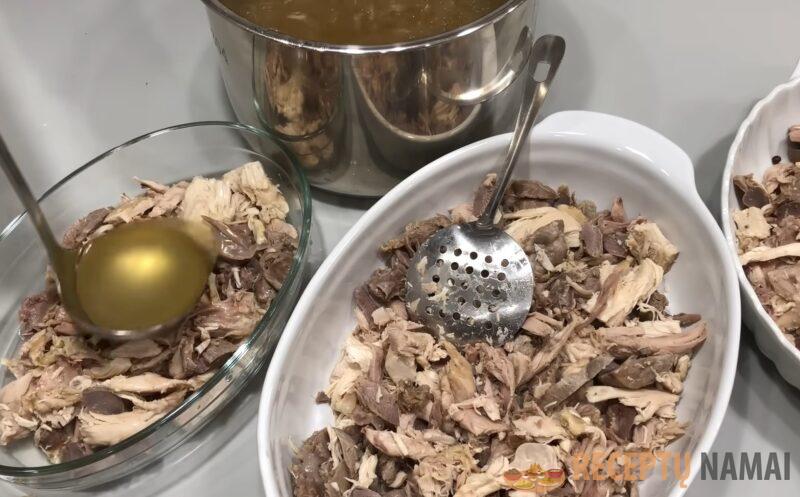 Jei želatina yra greitai tirpstanti, iš karto supilkite ją į sultinį. Jei želatina klasikinė, palaukiame, kol išbrinks, tada ištirpiname ją mikrobangų krosnelėje ir tik tada supilame į sultinį ir mėsą.