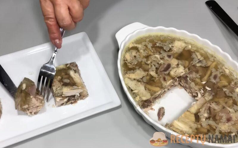 Sultinį pasūdykite, įdėkite česnako skiltelių. Atskirame dubenėlyje sumaišykite želatiną su pora samčių sultinio.
