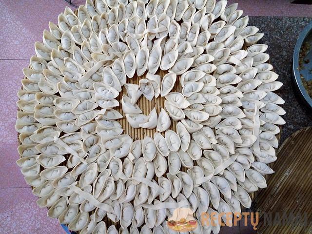 Nuimkite įdarą nuo ugnies ir atvėsinkite. Išminkykite tešlą. Į dubenį supilkite miltus, įberkite druskos, įmuškite kiaušinius ir supilkite augalinį aliejų. Išmaišykite ir supilkite verdantį vandenį. Kad tešla būtų minkšta, geriau minkyti planetiniu maišytuvu.