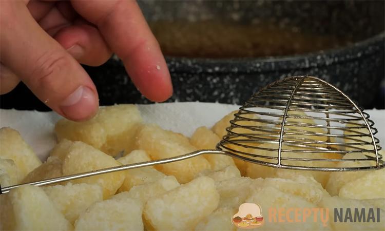 Nulupkite obuolius, išimkite šerdis, supjaustykite skiltelėmis ir trumpai pamirkykite vandenyje su cukrumi. Nusausinkite sietelyje, nusausinkite ir tada apvoliokite kukurūzų krakmole, užtikrindami, kad kiekviena skiltelė būtų tolygiai padengta. Įkaitinkite aliejų ir kepkite obuolius partijomis 2–3 minutes, kol šiek tiek apskrus.