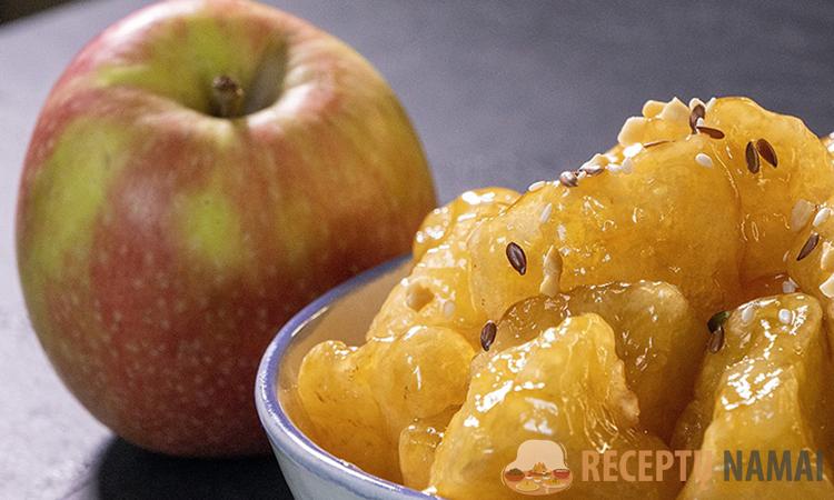 Ištirpinkite krakmolą vandenyje, įmaišykite jį į sirupą ir išplakite iki tirštos konsistencijos. Karštus obuolius sudėkite į glajų, tolygiai išmaišykite ir pabarstykite sezamo sėklomis arba riešutais.