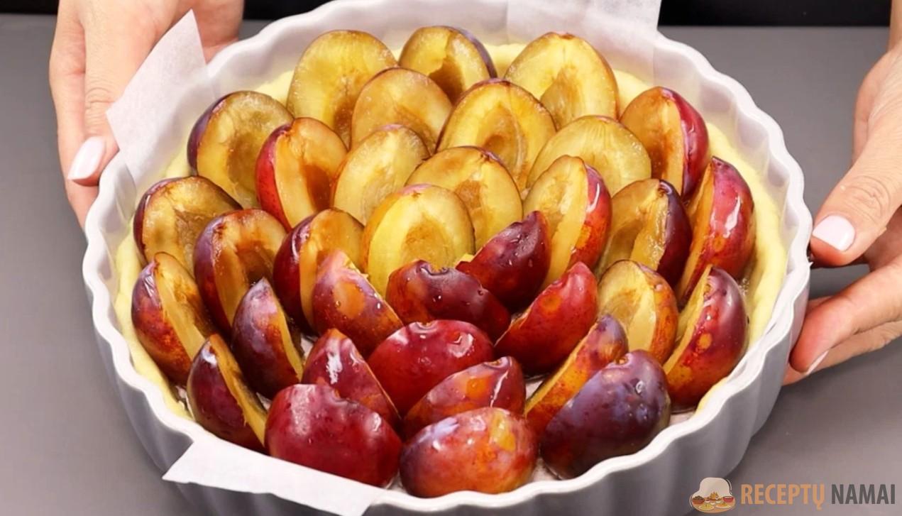 Slyvas perpjaukite į dvi dalis, išimkite kauliukus ir sudėkite ant tešlos.