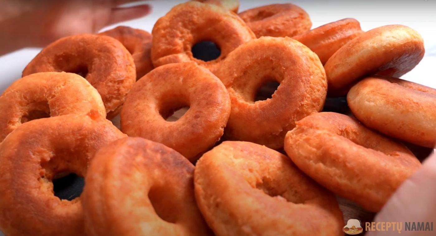 Tešlą iškočiokite 1,5 cm storio sluoksniu ir stikline išpjaukite apskritimus. Naudodami stiklinę nuo šlakelio arba butelio kakliuką apskritimų viduryje padarykite nedidelę skylutę.