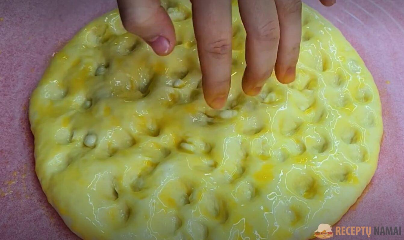 . Supilkite miltus ir pradėkite minkyti tešlą. Uždenkite mūsų ruošinį, kad tešla pakiltų ir padidėtų jos tūris