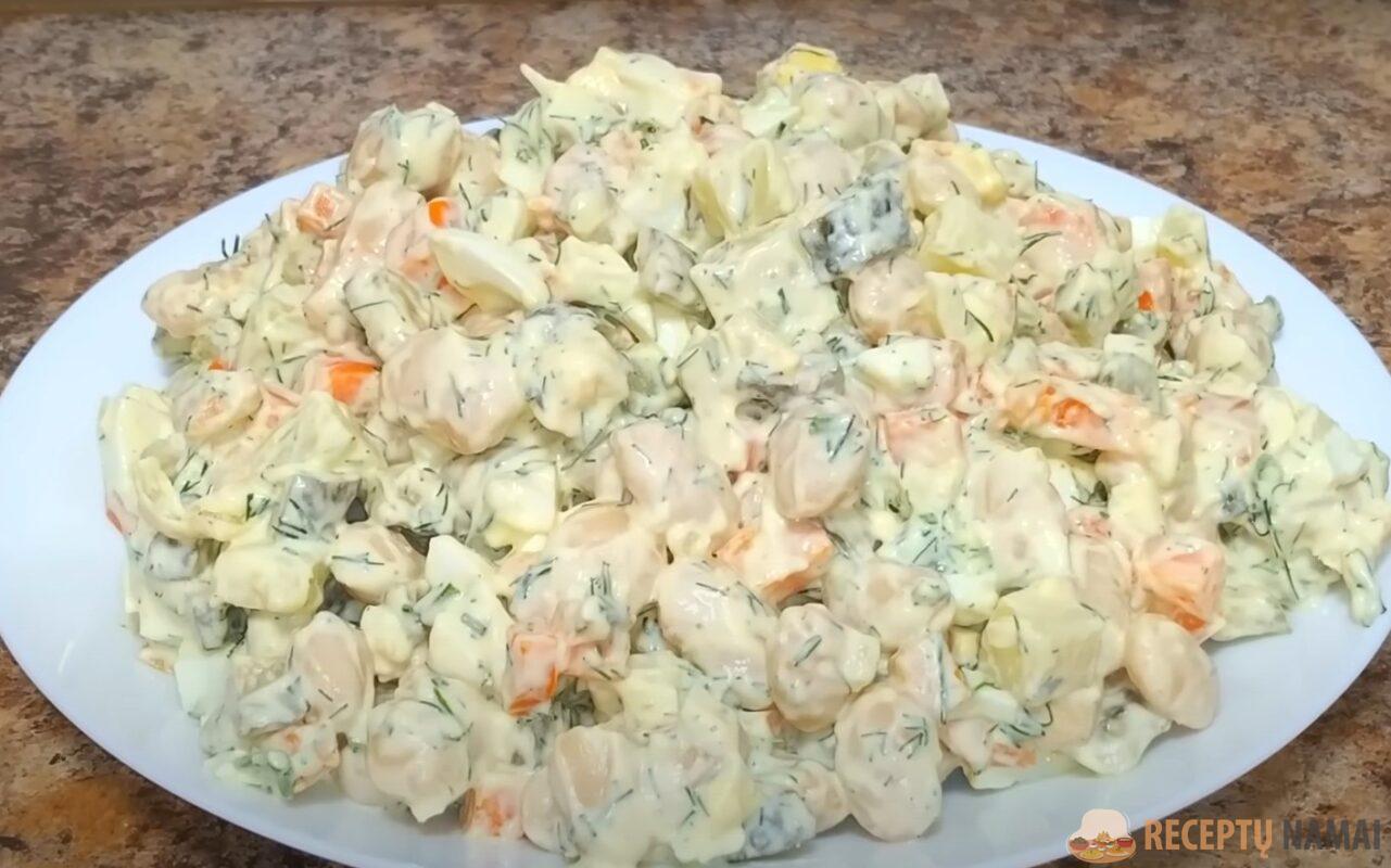 Nepamirškite salotų pagal skonį pasūdyti ir pagardinti pipirais. Gaunasi gana sočios salotos be mėsos ir dešros.