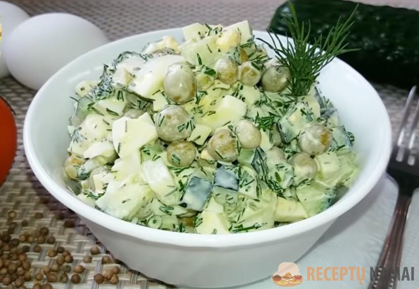 . Sumaišomas agurkas, kiaušiniai, konservuoti žalieji žirneliai, pagal skonį susmulkinti žalumynai