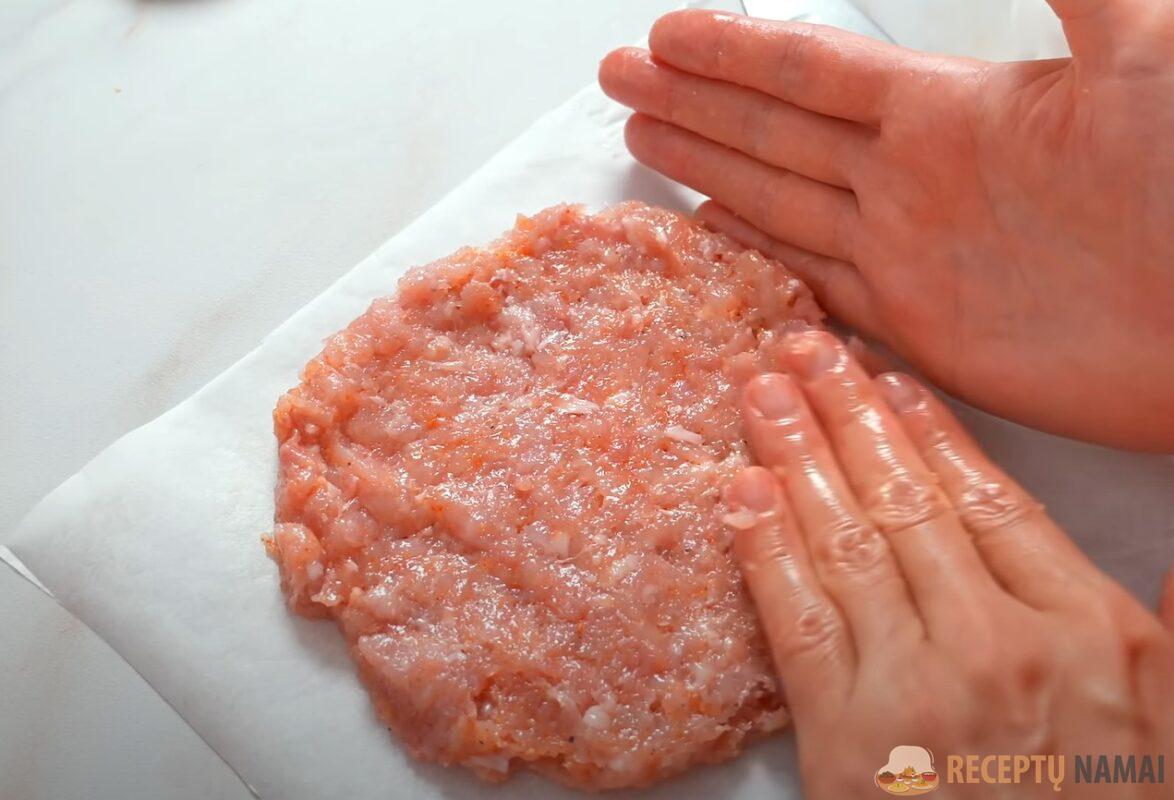 Vištienos filė susmulkinkite per mėsmalę ir paverskite malta mėsa. Į maltą mėsą įberkite druskos, džiovintų česnakų, paprikos, gerai išmaišykite