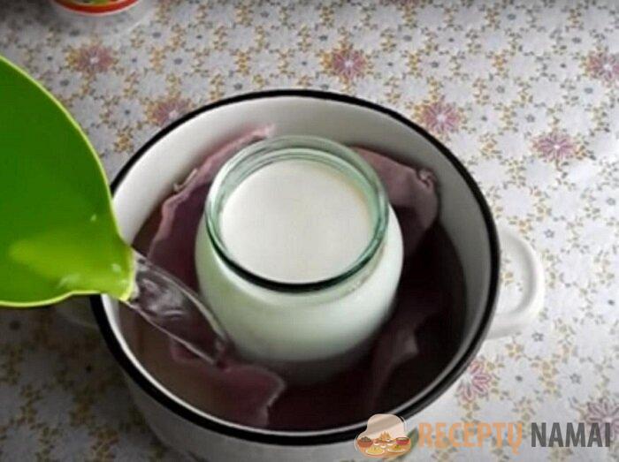 Grietinė pagal šį receptą ruošiama vandens vonioje, tai lengviausias būdas. Ant keptuvės dugno reikia pakloti kilpinį rankšluostį, ant jo uždėti litro stiklainį ir supilti pieną.