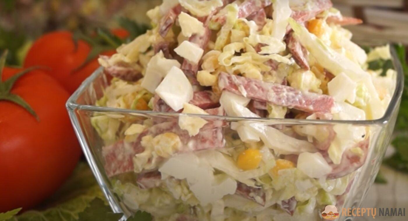 visą skystį. Susmulkintus kopūstus, dešrą, kiaušinius ir kukurūzus sumaišykite dubenyje. Apšlakstykite salotas majonezu ir gerai išmaišykite.