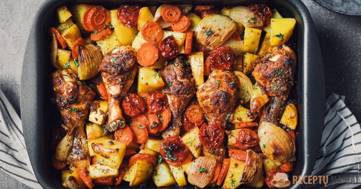 Pirmiausia nuplaukite vištieną ir nusausinkite. Pabarstykite druska bei pipirais ir palikite 15 minučių, kad prieskoniai įsigertų. Bulves nulupkite ir supjaustykite stambiais gabalais. Morkas sutarkuokite stambiai arba supjaustykite juostelėmis. Svogūnus supjaustykite pusžiedžiais.