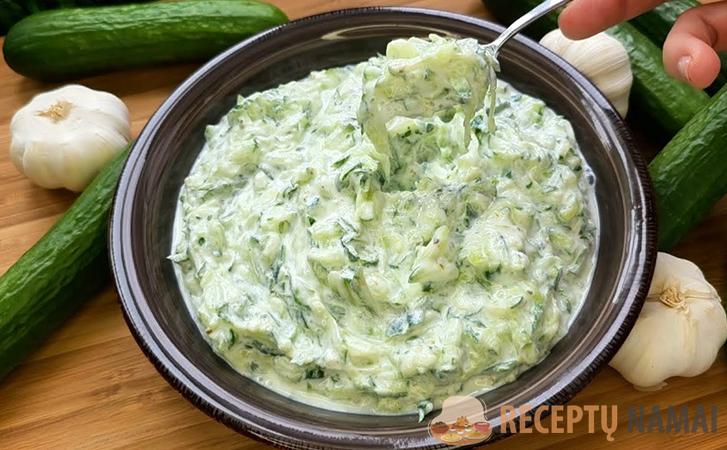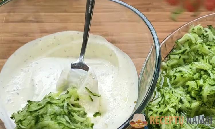 Pradėkite nuo agurkų. Juos reikia smulkiai sutarkuoti. Sudėkite juos į dubenį ir pabarstykite druska. Leiskite jiems pastovėti 30 minučių. Tai padės jiems atpalaiduoti drėgmės perteklių. Kol agurkai ilsisi, paruoškite padažą. Į dubenį su graikišku jogurtu įpilkite česnakų kremo arba susmulkinto česnako.
